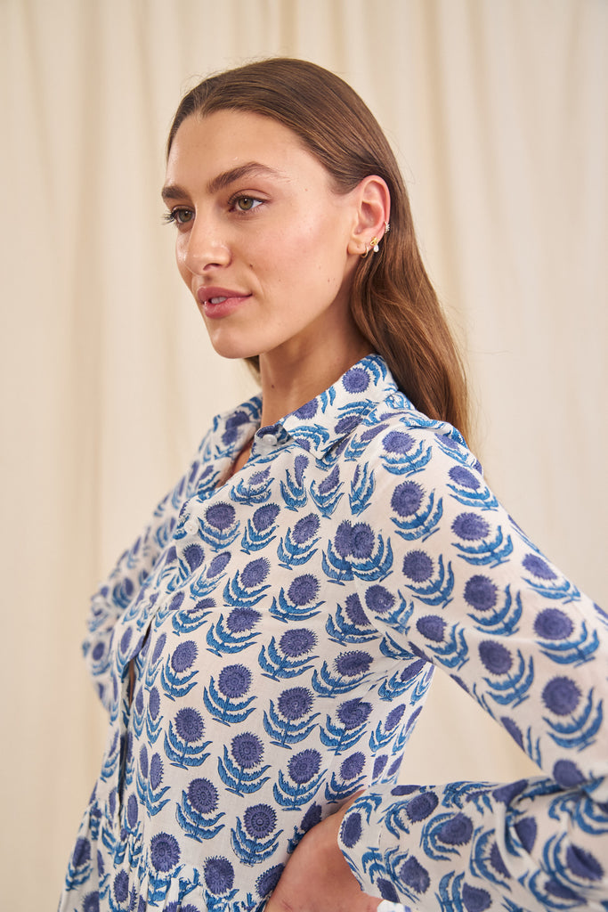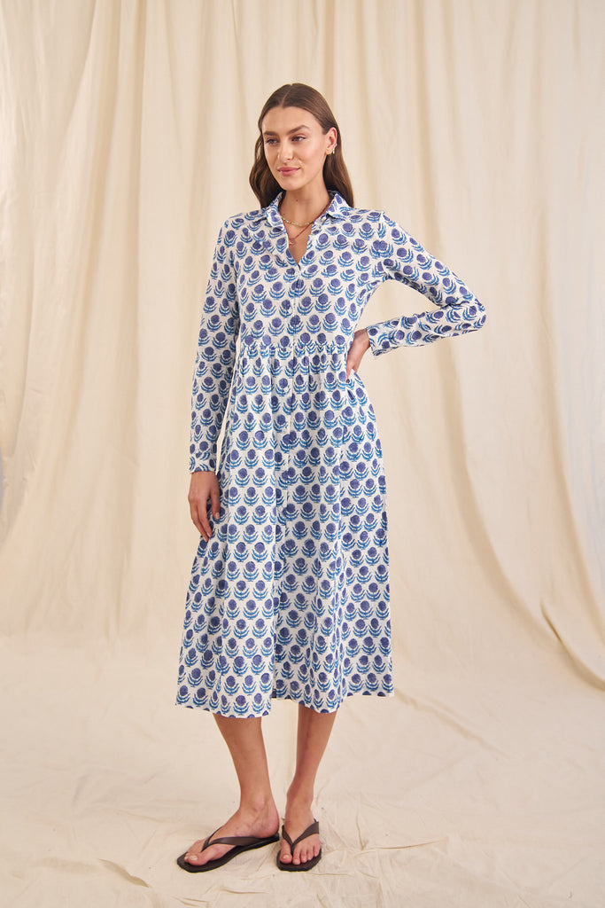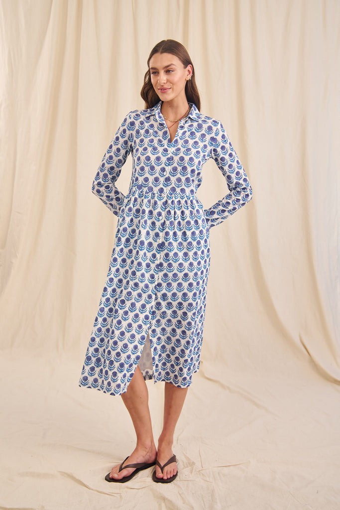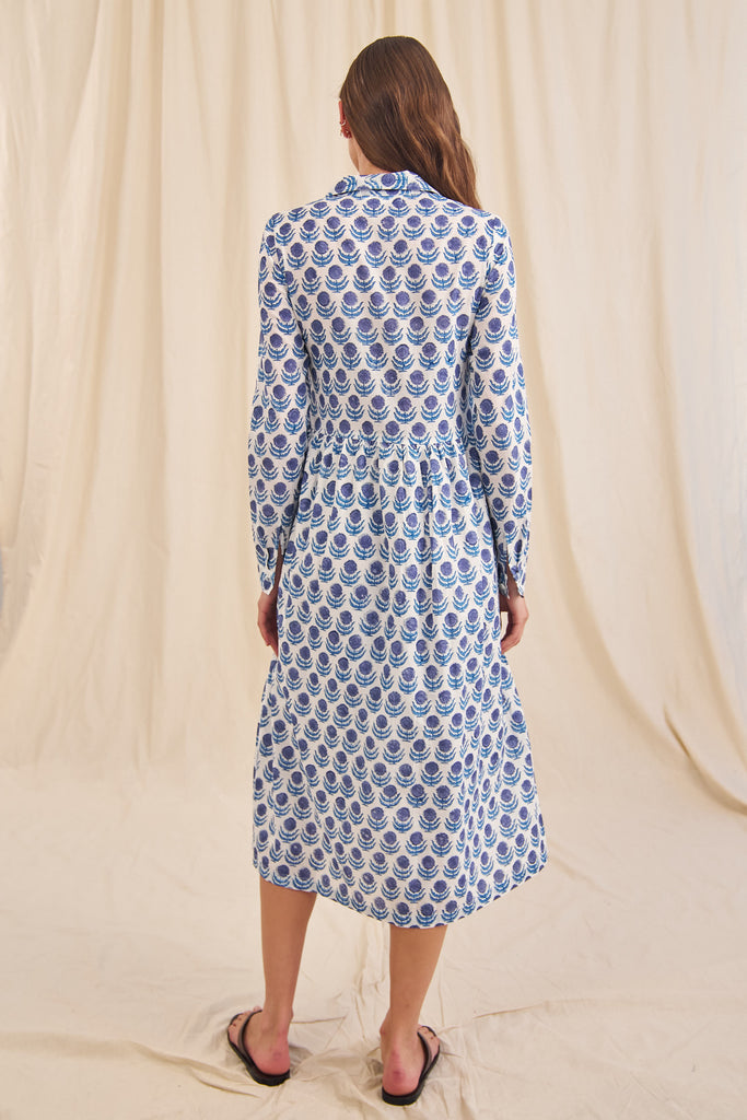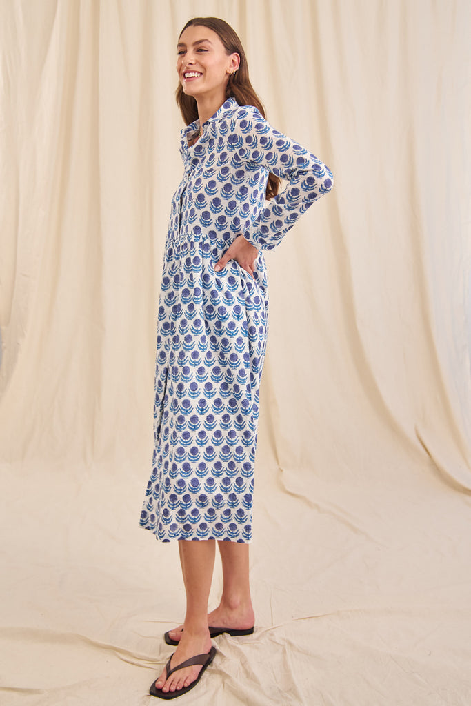 The Rosa is the perfect trans-seasonal dress. With a small collar and button down front and pockets, this 100% organic cotton dress is great to wear as is or unbutton and wear as a duster jacket over jeans and a T. Rosa has a lined skirt.