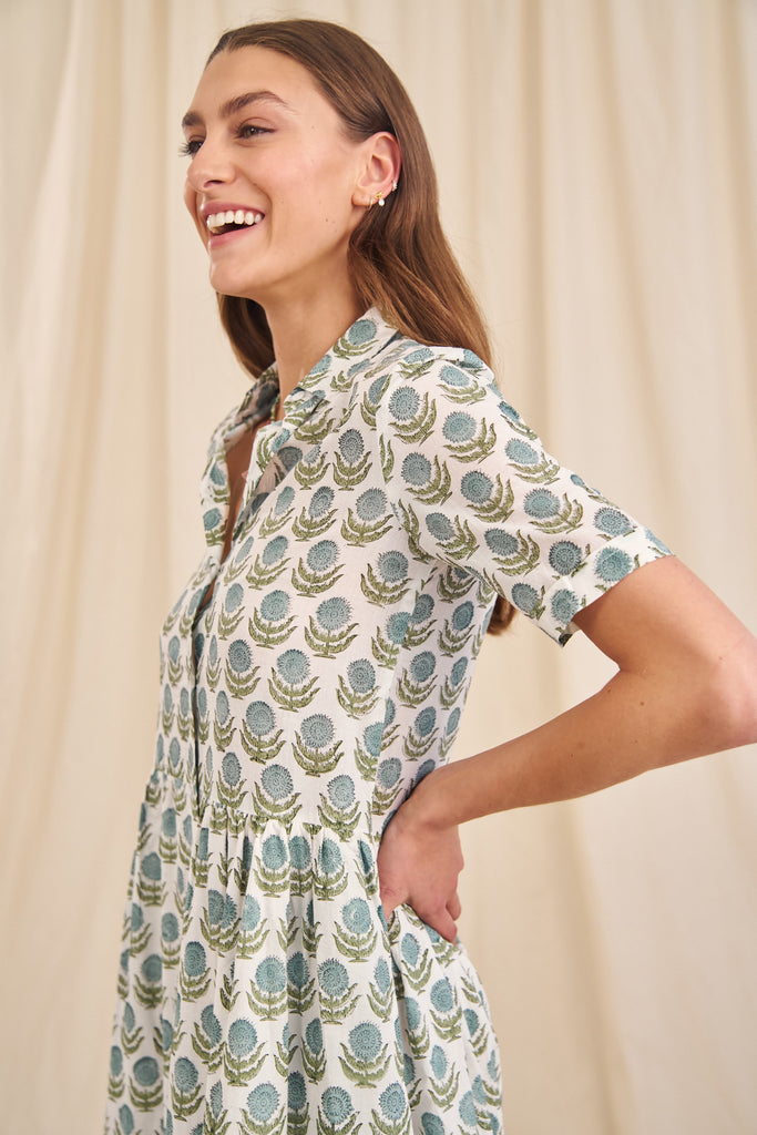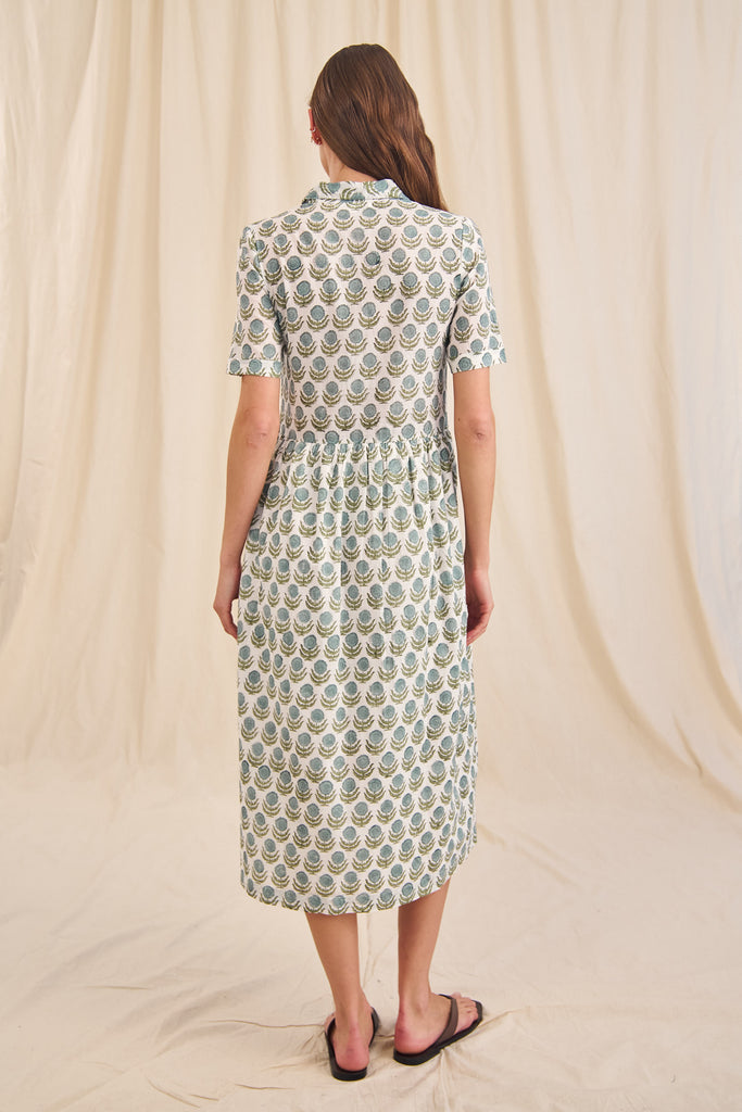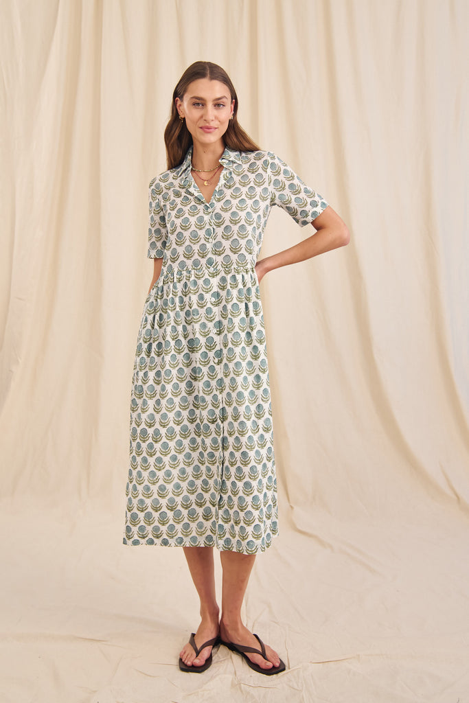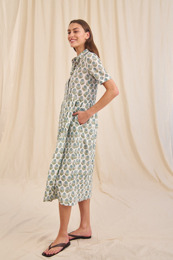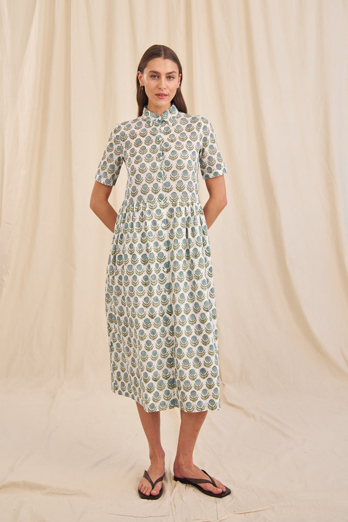 The Rosie has a small collar, button down front and pockets. The skirt of this 100% organic cotton dress is lined. The sizing around the bust on this dress is a little smaller than usual so we suggest going up a size