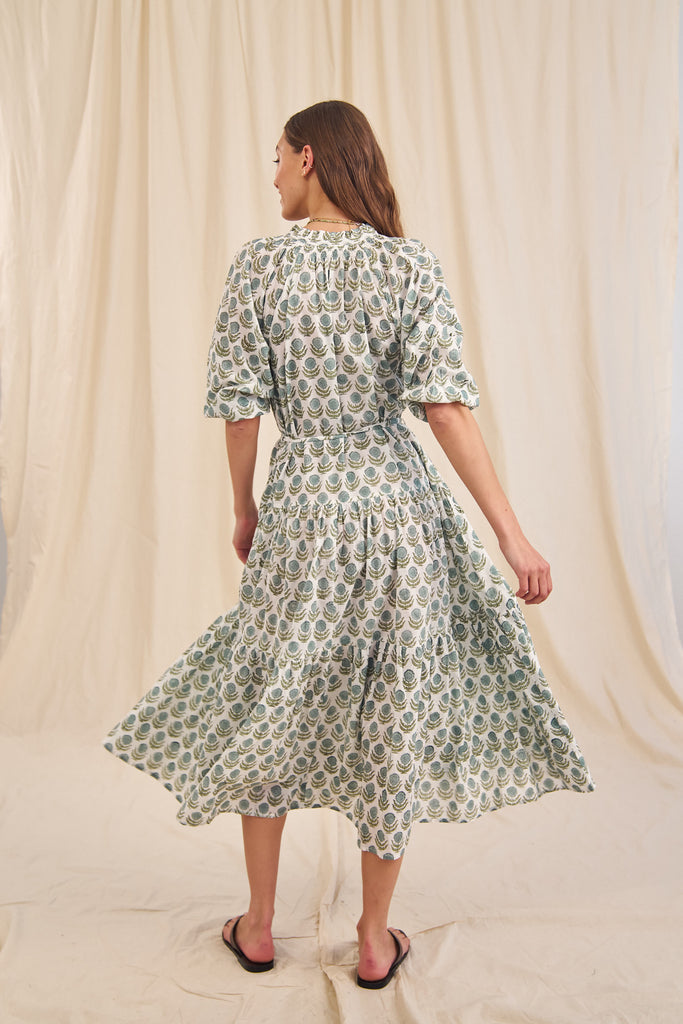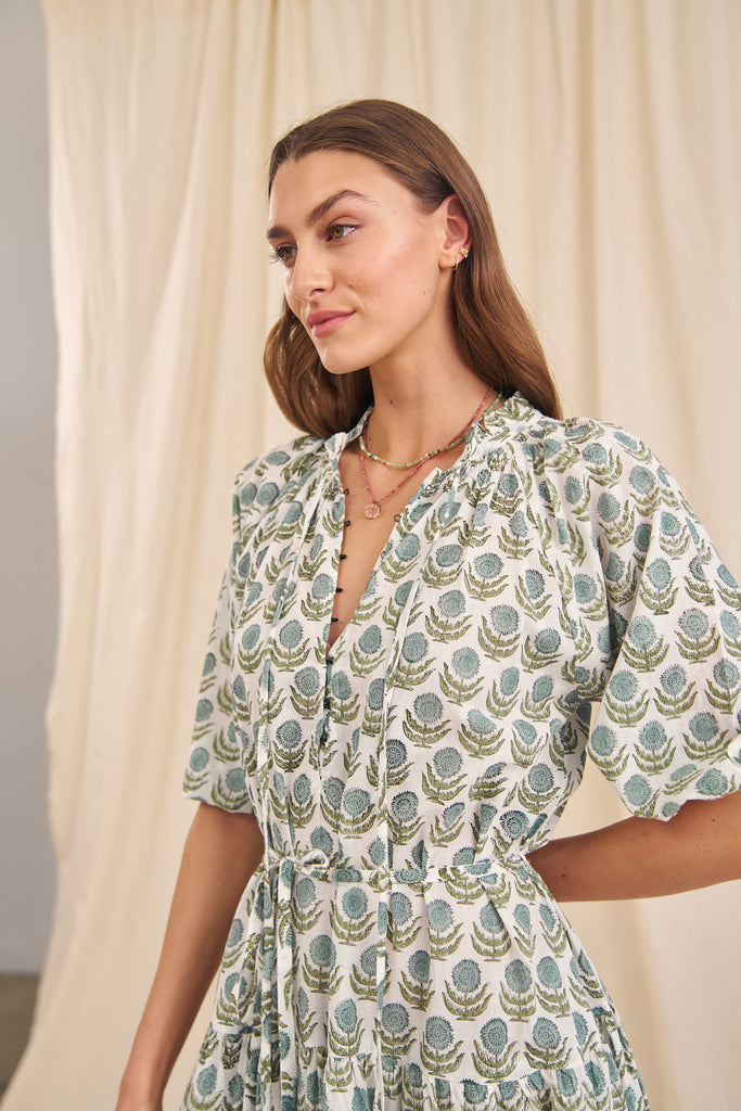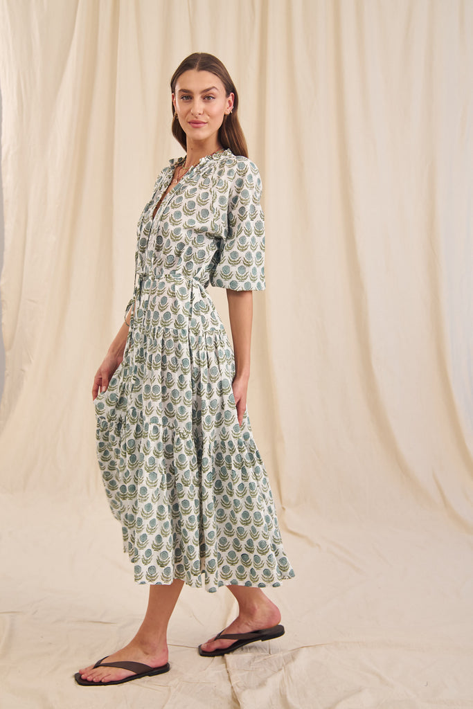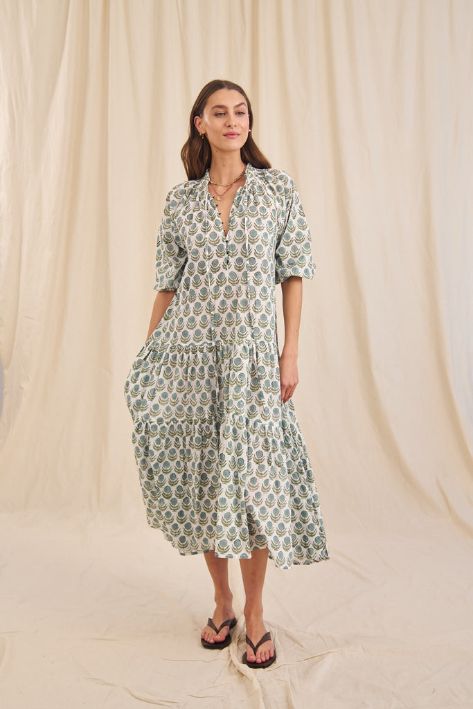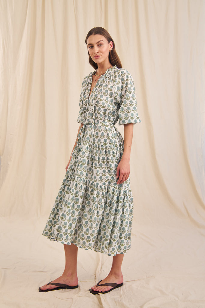 Rebecca is the perfect trans-seasonal dress.  This breezy, tiered 100% organic cotton dress is so easy to wear. It has a detailed frill and ties at the neck and a slim belt at the waist. Wear with or without the belt, either looks fabulous!